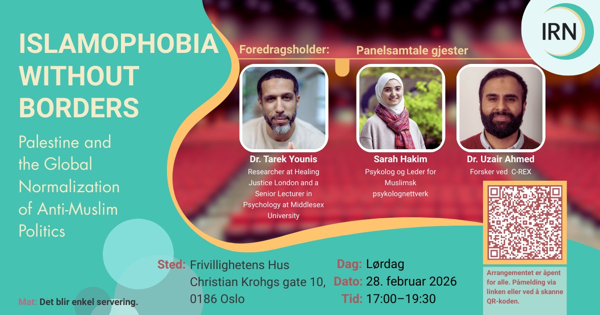 Vi får besøk av Dr. Tarek Younis, Racial Justice Researcher ved Healing Justice London og Senior Lecturer i psykologi ved Middlesex University. Han forsker på islamofobi, rasisme i psykisk helsevern og hvordan sikkerhets- og antiterrorpolitikk påvirker muslimers liv. Som klinisk psykolog arbeider han særlig med erfaringer knyttet til rasisme, statlig vold og marginalisering. Han er også forfatter av boken The Muslim, State and Mind: Psychology in Times of Islamophobia.